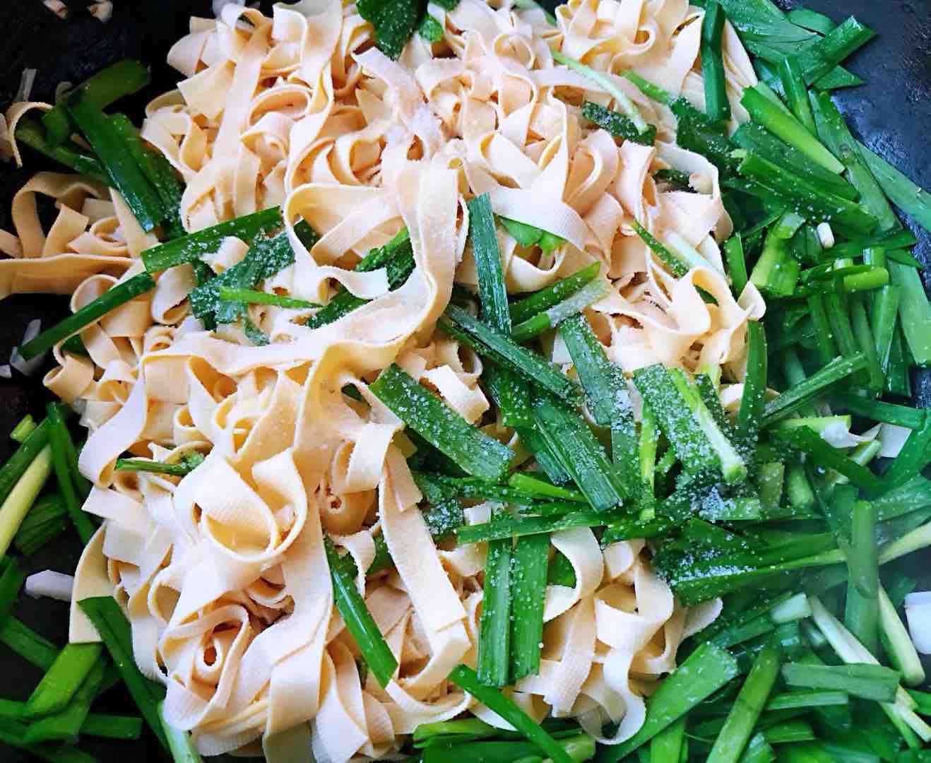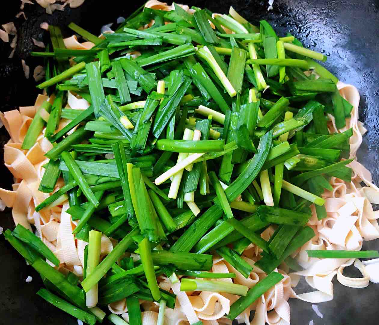 最佳答案韭菜炒千张丝的做法:1、准备材料:千张100克、韭菜80克、蒜10克、油0.5勺、盐2匙、味精0.2匙。2、韭菜摘好洗净切段。3、千张切成一厘米左右的丝状。4、锅中烧开水,放入千张丝焯水,去除豆腥味。5、焯好水的千张丝立即放入冷水中过凉,沥干水分。6、锅中倒入底油加热放入蒜粒爆香。7、放入千张丝,...