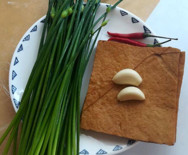 1.准备好一小把韭菜花和3块五香豆腐干。
