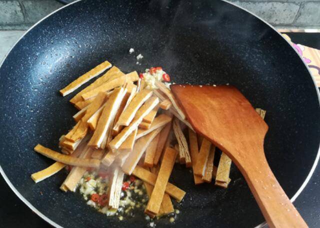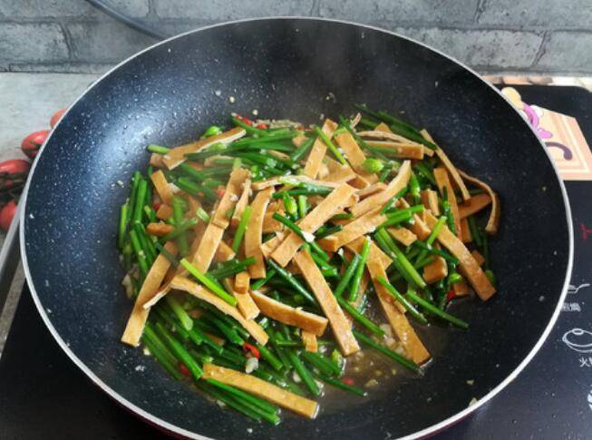 用料:韭菜花一小把、五香豆腐干3块、蒜米2瓣、辣椒2个、生抽适量、食用油10克、盐2克。