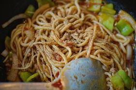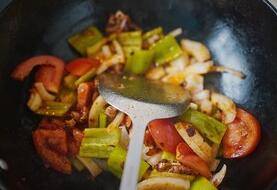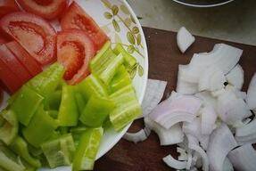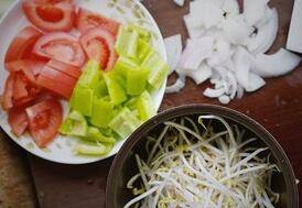 用料:盐5克、西红柿1个、洋葱半个、青椒1个、绿豆芽1包、豆瓣酱1大勺、孜然粉1勺、牛肉一小块。