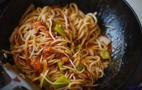 6、放入番茄、青椒、洋葱、绿豆芽,再加入一些水。
