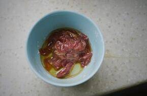 3、牛肉用料酒酱油食用油淀粉,抓一下腌一会。