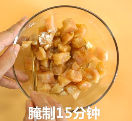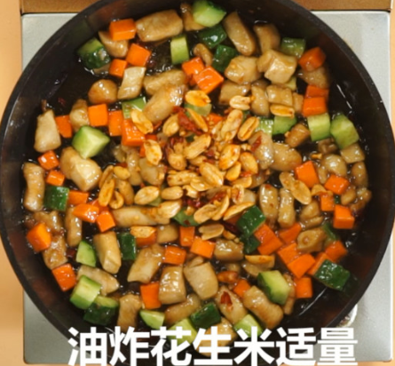 锅中放油,倒入姜末、干辣椒、花椒,倒入鸡肉丁,过油30秒;
