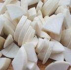 2、白萝卜去皮切滚刀块,肋排剁成块,香葱切成葱花,切好姜片,洗净枸杞。