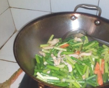 倒入蒜苔和胡萝卜炒匀;