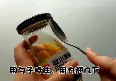 用勺子抵住,用力翘几下即可轻松去盖。