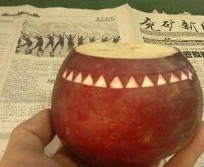 用勺子将萝卜的心掏一个圆形的洞,洞的大小,决定了灯笼可以存放油的容量。