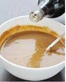 把酱豆腐用勺子碾碎,尽量细腻一些,连同酱豆腐汁一起倒入芝麻酱里,继续朝一个方向搅匀。