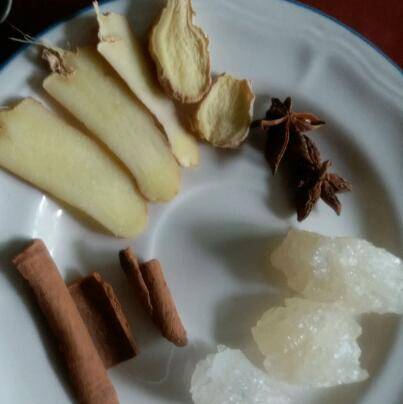 2、准备好葱姜、桂皮、八角、冰糖、普洱茶。