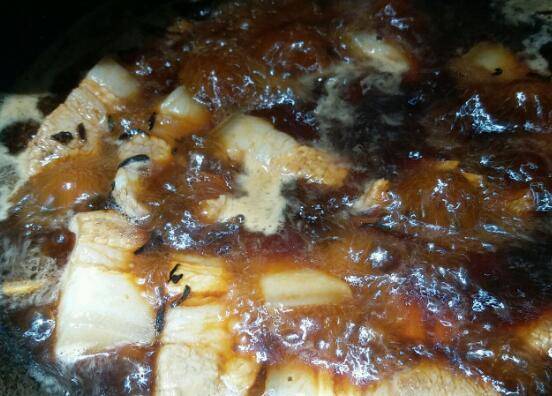 5、五花肉入炒锅,加入料酒、冰糖、盐、生抽、茶水等,水量没过肉块即可。