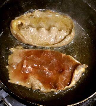 3、中火热锅后抹很薄一层油,不粘锅可以不放油。转中小火放入薄片煎,煎至一面变色就翻面,二面都变白即可出锅。