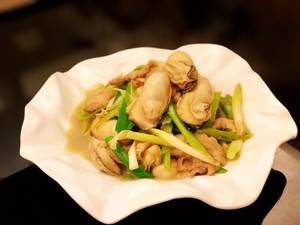 用料:五花肉、生蚝、蒜苗、盐、生抽、姜丝、蒜苗。