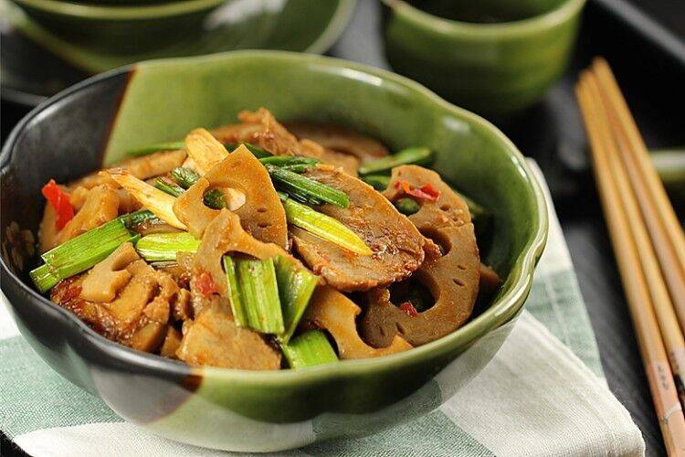 9、放入藕片一起翻炒。