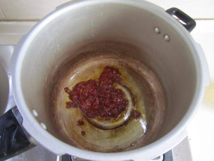 7、烧热锅,放少许油,下入豆瓣酱煸炒。