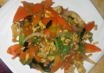 洋葱20g、辣椒10g、鸡蛋1个、干海带5g、胡萝卜100g。把胡萝卜蒸熟,辣椒洋葱切丝。干海带泡发,鸡蛋打碎。先炒鸡蛋,再把所有材料放入翻炒,加入盐、酱油,翻炒两分钟即可出锅。