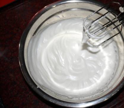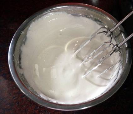 4、将混合溶液加入到蛋白霜里,用电动打蛋器继续打发至浓稠状态,出现纹路且纹路不容易消失为止。