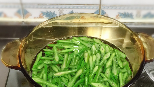 锅烧开水,放少许盐、几滴油,下入刀豆,焯5分钟。捞出过凉水,保持翠绿。