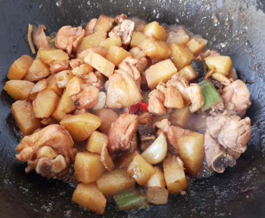土豆、鸡架洗净改刀备用,葱、姜、蒜、红辣椒改刀;
