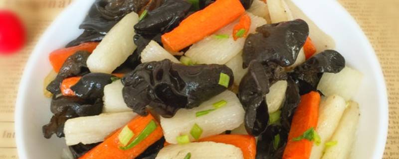 主料:黑木耳100克、胡萝卜半个、山药200克、盐1小勺、鸡精少许、蒜瓣3个、葱2棵。