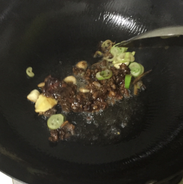 同时放入葱姜蒜和肉末,翻炒至肉末变色。
