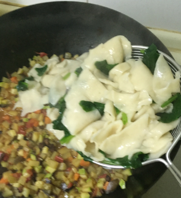五花肉200g、面粉500g、茄子半个、红萝卜半根、西葫芦半根、土豆一个、菠菜几根、西红柿一个、葱姜蒜少许、盐、料酒、酱油、生粉少许。