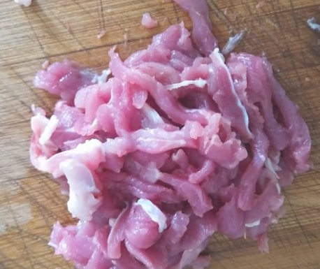 锅中倒入花生油,加入肉丝炒得肉色发白,再加入蒜末炒香。