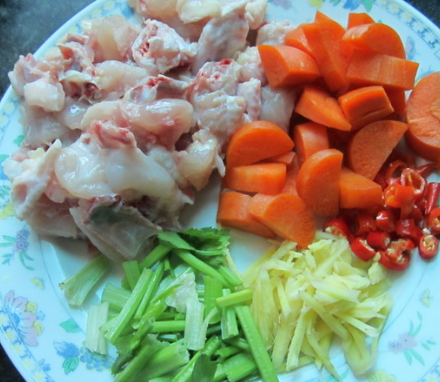 鸡和红萝卜切丁,姜切丝,芹菜切丝;