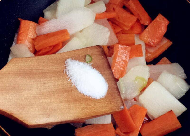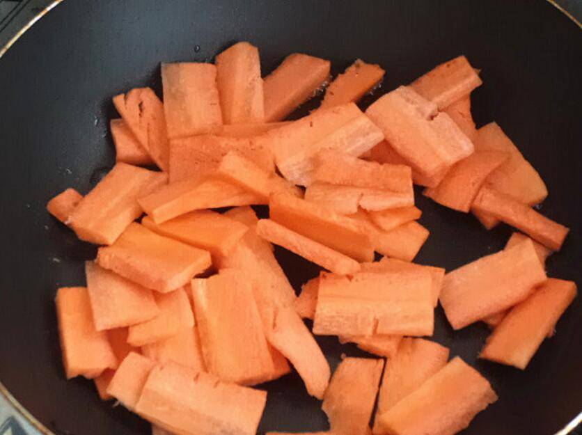 5、胡萝卜入锅炒。