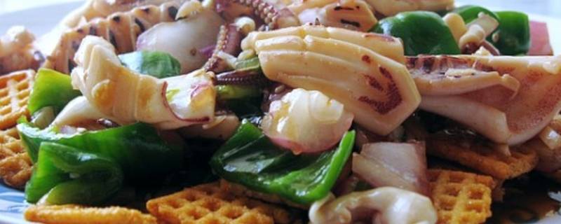 1、准备材料:鱿鱼、锅巴、蒜、蚝油、番茄酱、白糖、柿子椒、洋葱。