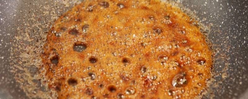 3、变色继续炒,期间不停搅动,直到糖分糊化变色。