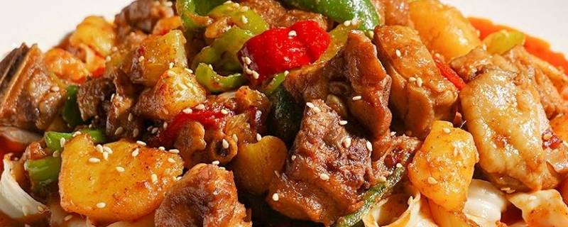 6、新疆大盘鸡:新疆大盘鸡是新疆地区名菜,大约起源于80年代末期,主要用料为鸡块和土豆块,配皮带面烹饪而成。新疆大盘鸡色彩鲜艳,有爽滑麻辣的鸡肉和软糯甜润的土豆,辣中有香,粗中带细,而且经济实惠。