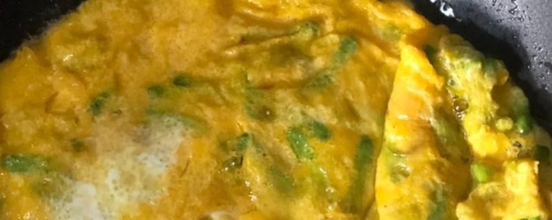 4、炒锅烧热油,小火倒入金雀花蛋液煎透。