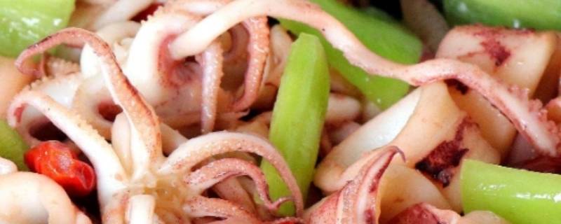 2、锅热,倒油,油温五成热的时候倒入鱿鱼,翻炒。