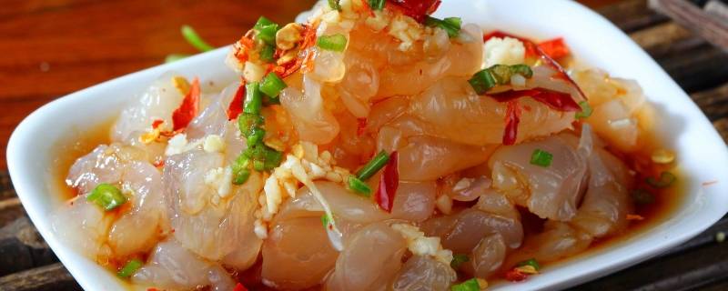 3、莆田海蜇:莆田食用和白卤和红卤十分方便,只须将其放在冷开水中浸泡,洗净卤水,再切成细条,就可蘸着加醋的酱油食用,清脆可口,海蜇是莆田群众十分喜爱的海产品,它的加工成品不但是一种可口的家常菜,还是宴会上调节口味、冷盘佐酒的精美小菜。