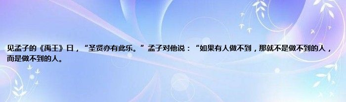 大家好,小常来为大家解答以上问题。见孟子的《禹王》曰,“圣贤亦有此乐。”孟子对他说:“如果有人做不到,那就不是做不到的人,而是做不到的人。很多人还不知道,现在让我们一起来看看吧!