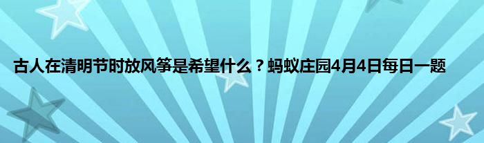 古人在清明节时放风筝是希翼什么?清明节到了,蚂蚁庄园的问题也都和清明节有关,今天的问题是古人在清明节时放风筝是希翼?放风筝是寄予一种信念,那么古人为什么要放风筝呢,下面就来跟着小编一起来看一下具体答案吧。
