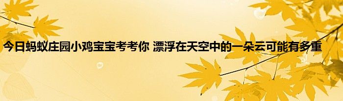 欢迎大家来到这里,能进来的小伙伴都有玩蚂蚁庄园的,支付宝蚂蚁庄园每天都会在小课堂更新一道题目,答对即可领取小鸡饲料180G,4月14日蚂蚁庄园问题是:漂浮在天空中的一朵云可能有多重?很多小伙伴都不知道漂浮在天空中的一朵云可能有多重?这个问题的答案是什么,那么小编就为大家分享下4月14日蚂蚁庄园课题问题的答案,希望对大家有所帮助!