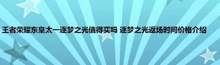 随着王者荣耀的更新,东皇太一的限定皮肤逐梦之光也限时返场了。对于皮肤比较少的东皇太一来说,这无疑是一大令东皇玩家狂喜的好事。那么这次返场逐梦之光值得入手吗?返场时间和价格又是怎样的呢?一起来看看吧~