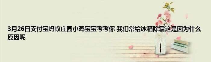 关于3月26日支付宝蚂蚁庄园小鸡宝宝考考你 我们常给冰箱除霜这是因为什么原因呢,这个话题最近也很火热吧,那么现在就为大家具体说说3月26日支付宝蚂蚁庄园小鸡宝宝考考你 我们常给冰箱除霜这是因为什么原因呢,小编也为小伙伴们收集了很多有关我们常给冰箱除霜这是因为什么原因呢,希望对小伙们有所帮助。
