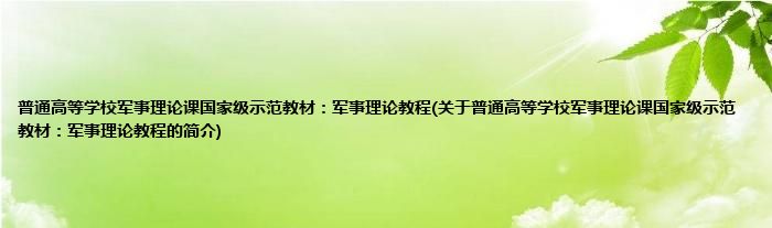 1、 《军事理论教程》是根据教育部、总参谋部、总政治部2007年颁发的《普通高等学校军事课教学大纲》,由教育部体育、卫生与艺术教育司组织有关专家编写的普通高等学校本、专科军事课国家级示范教材。