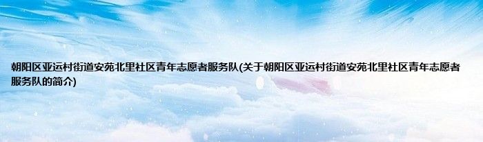 1、 朝阳区亚运村街道安苑北里社区青年志愿者服务队是由朝阳区亚运村街道青年志愿者服务队领导下的志愿团体。
