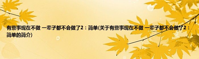 大家好,有些事现在不做,一辈子都不会做了2:简单,关于有些事现在不做,一辈子都不会做了2:简单的简介很多人还不知道,现在让我们一起来看看吧!