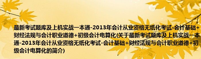大家好,最新考试题库及上机实战一本通-2013年会计从业资格无纸化考试-会计基础+财经法规与会计职业道德+初级会计电算化,关于最新考试题库及上机实战一本通-2013年会计从业资格无纸化考试-会计基础+财经法规与会计职业道德+初级会计电算化的简介很多人还不知道,现在让我们一起来看看吧!